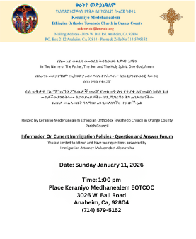 By the Grace of Almighty GOD, we humbly and lovingly established the new parish of “Keraniyo Medehanealem Ethiopian Orthodox Tewahedo Church in Orange County". Our intention is to build a house of worship, not made with stones and stony hearts, but which is sprinkled with clean, life‐ giving water, and filled with warm hearts turned upward to GOD and reaching out to our families, friends, and new neighbors.